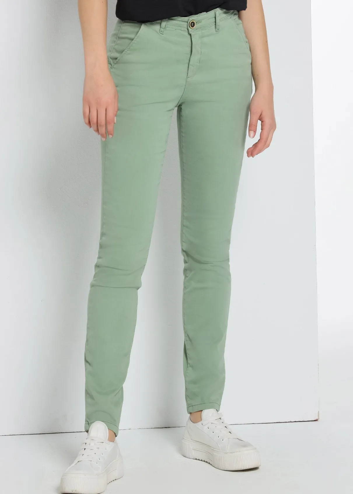 CIMARRON – Chino Clyde-Nectar | Taille basse | 135345 Composition : 97% COTON 3% ÉLASTHANNE Traitement : Lavage max 30º GENRE : Femme Couleur : Vert Saison : Primavera – Verano Type de produit : PANTALONES Coupe : Classique Fermeture : Zip et bouton Style : Décontracté Taille : CAJA BAJA